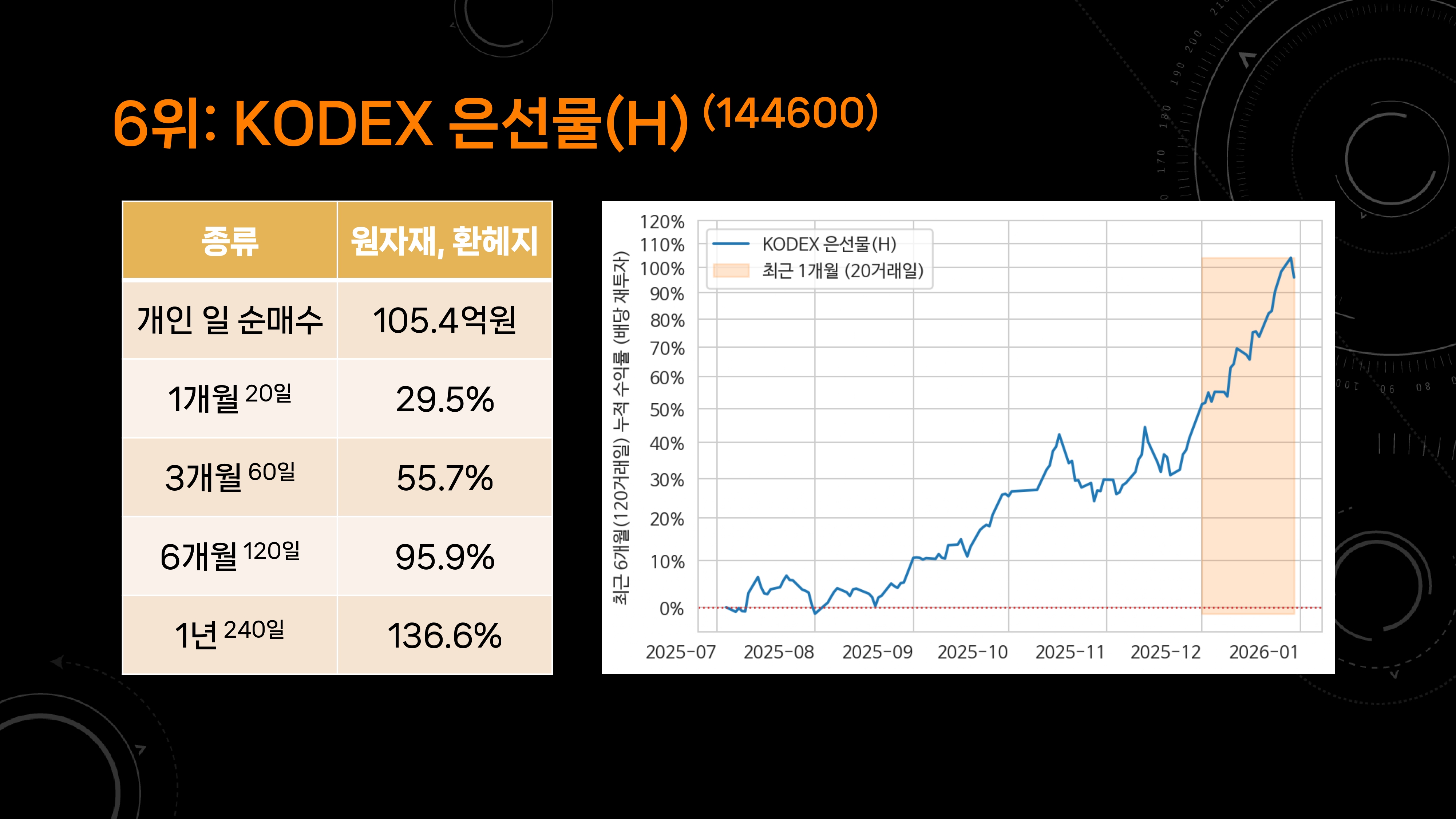 개인 투자자는 기관 투자자와 달리 손절보다는 익절 또는 다른 상품으로의 교체하기 위해 매도하는 경향이 있습니다. 그러니 순매도 상위 순위 ETF의 미래 전망에 부정적이라기보다, 수익률 충분히 얻었거나 더 나은 상품으로 바꾸려는 목적이 있다고 보는 것이 적절합니다.
