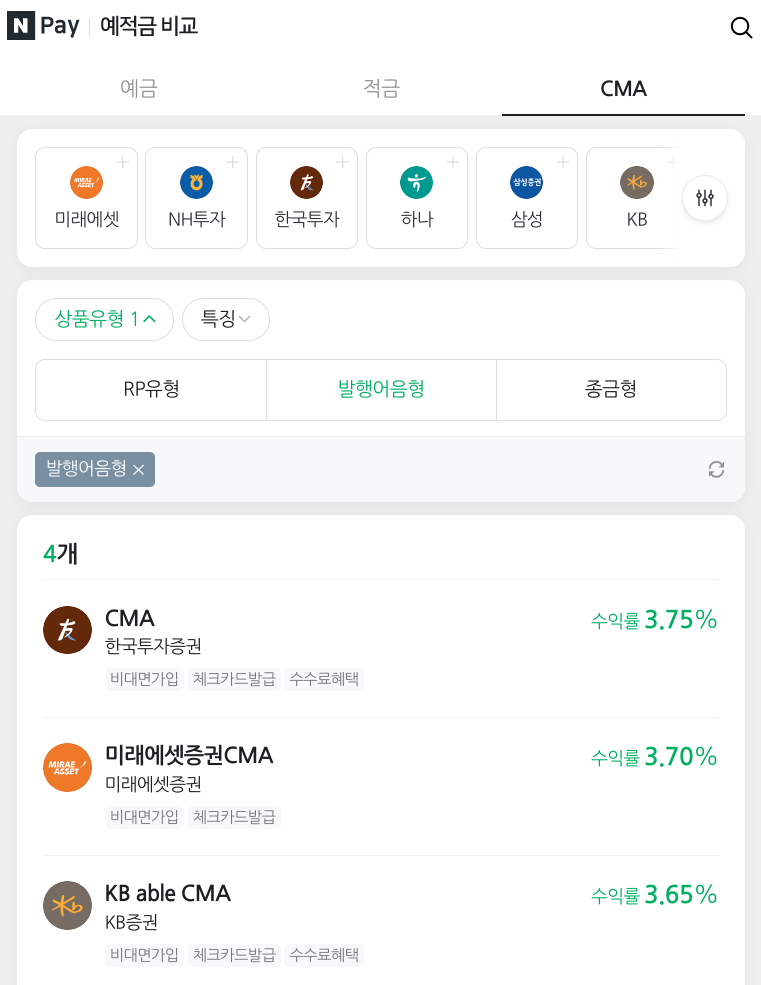 발행어음형을 선택한 화면입니다. 2023년 4월 15일 현시점에는 한국투자증권이 연 3.75%의 가장 높은 금리를 제공합니다.