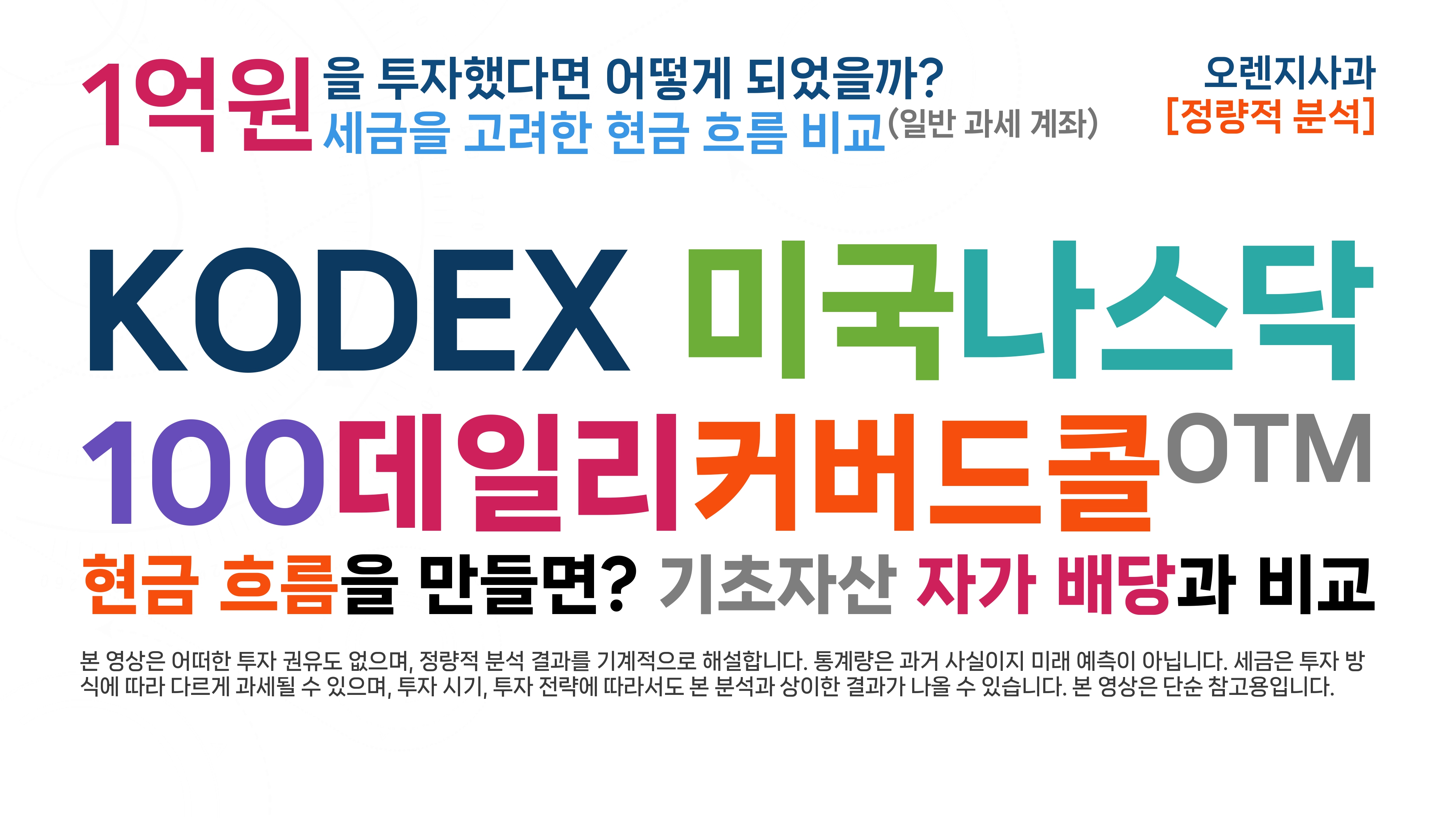 골드만삭스의 GPIX는 S&P 500과 비슷하게 기초자산을 구성하고 펀드 매니저가 운용에 관여하는 액티브 커버드콜입니다. 본 영상에서는 GPIX의 첫 거래일에 GPIX와 S&P 500 지수를 추종하는 SPY에 각각 1만 달러를 투자하고, 동일한 세후 현금 흐름을 만들었을 때, 어떤 결과를 얻게 되었을지 분석해 봅니다.일반 과세 계좌를 가정하여 다음과 같은 설정으로 비교 분석합니다.커버드콜: GPIX기초자산(비교 자산): SPY분석기간: 2023년 10월 27일 ~ 2025년 10월 31일 (약 2.0년)GPIX의 첫 거래일 2023년 10월 27일 종가로 1만 달러를 거치식으로 투자배당소득세: 15.4%(국내)/15%(해외) (위클리 커버드콜의 프리미엄 배당금은 비과세)양도소득세: 15.4%(국내)/22..