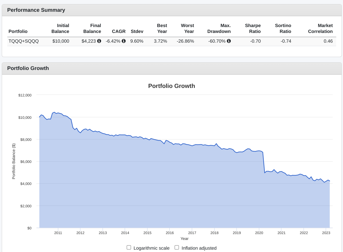 주의: 이 글은 레버리지 투자를 권유하지 않습니다. 동일한 레버리지 배율이라면, 비슷한 중장기 성과를 거둘 수 있음을 나스닥 100 지수 관련 ETF로 보여주기 위한 글입니다.레버리지 배율에 따른 다양한 상품과 조합나스닥 100 지수를 추종하는 ETF 중에 널리 알려진 상품은 QQQ입니다. 나스닥 100 지수의 수익률을 일일 레버리지로 추종하는 상품도 있습니다. QLD는 2배 레버리지이며, TQQQ는 3배 레버리지입니다. 심지어는 5배 레버리지인 QQQ5도 있습니다.나스닥 100 지수가 장기적 또는 단기적으로 상승할 것이라는 확신을 가지고, 2배 레버리지 상품을 매수한다고 하겠습니다. QLD를 매수해도 되지만, 이론상으로는 다음과 같은 조합 모두 2배 레버리지 효과를 낼 수 있습니다.QLD 100% (2..
